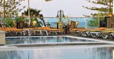 The sun terrace on the 1st floor with the swimming pools and the jacuzzi offers an amazing view to the Aegean sea, the Yacht Marina and kos port . The poolside bar serves delicious snacks and drinks . Enjoy a refreshing drink on the free sunbeds and umbrellas surrounding the pool area.